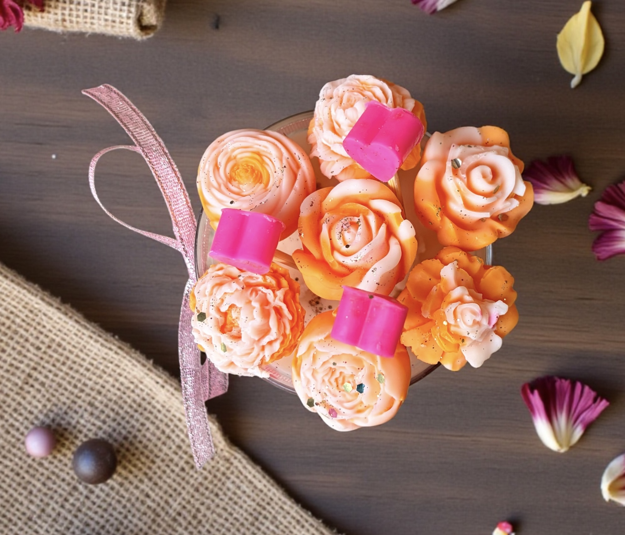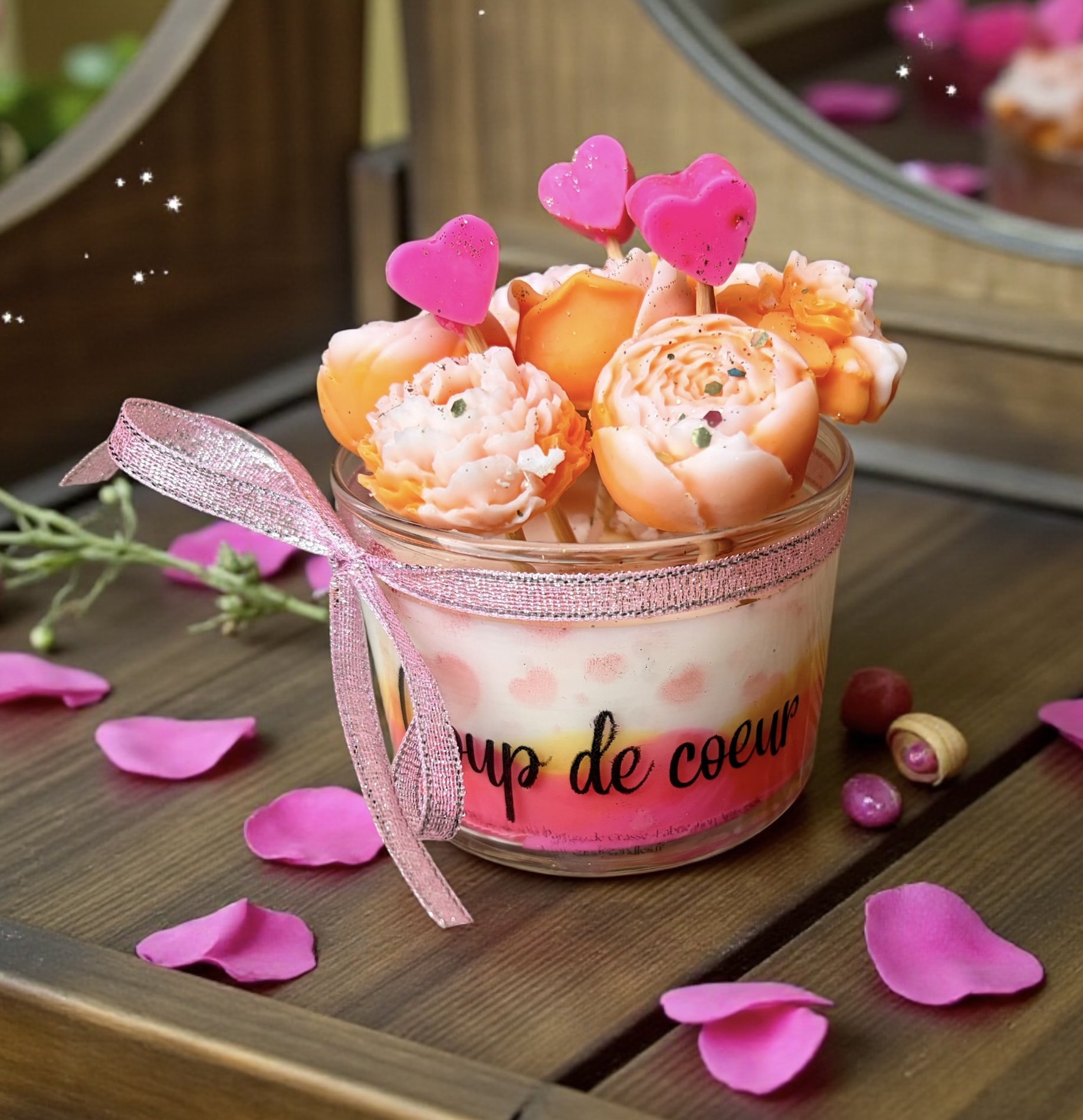 Cette bougie bouquet est entièrement réalisée à la main, avec de délicates fleurs et cœurs en cire fondante, soigneusement disposés pour un effet waouh dès le premier regard.