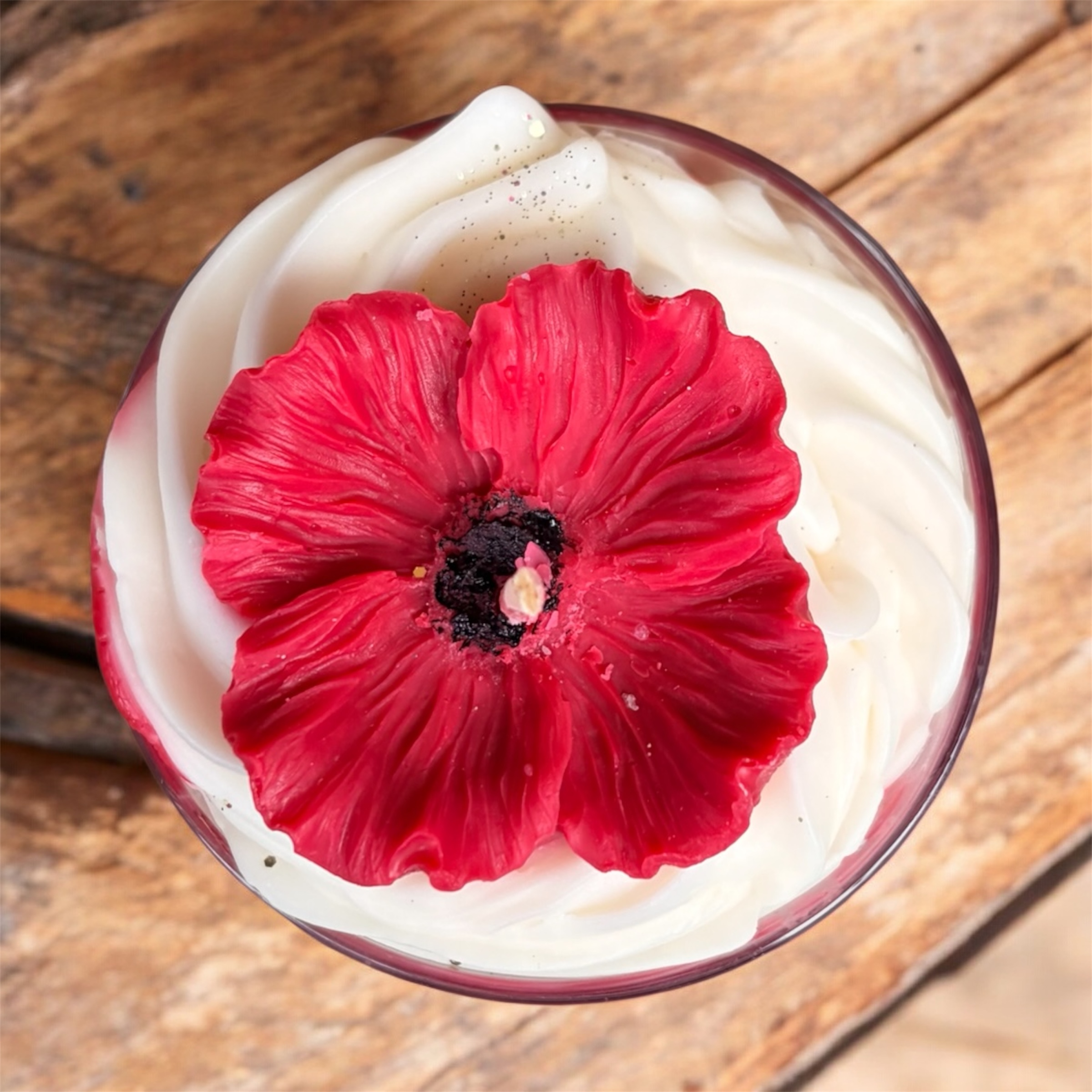 Bougie artisanale décorée d’un coquelicot en cire et d’un élégant effet marbré rouge et blanc.