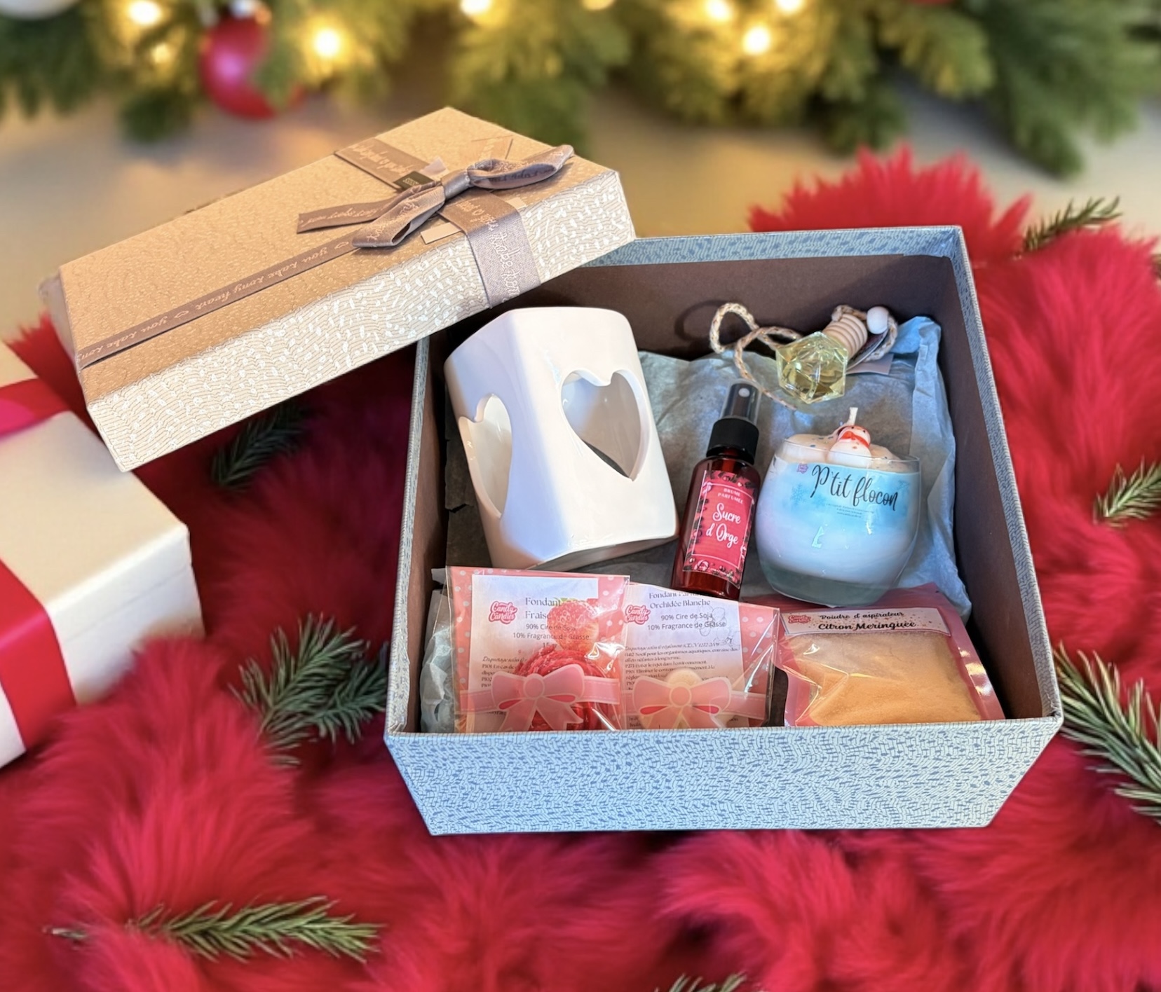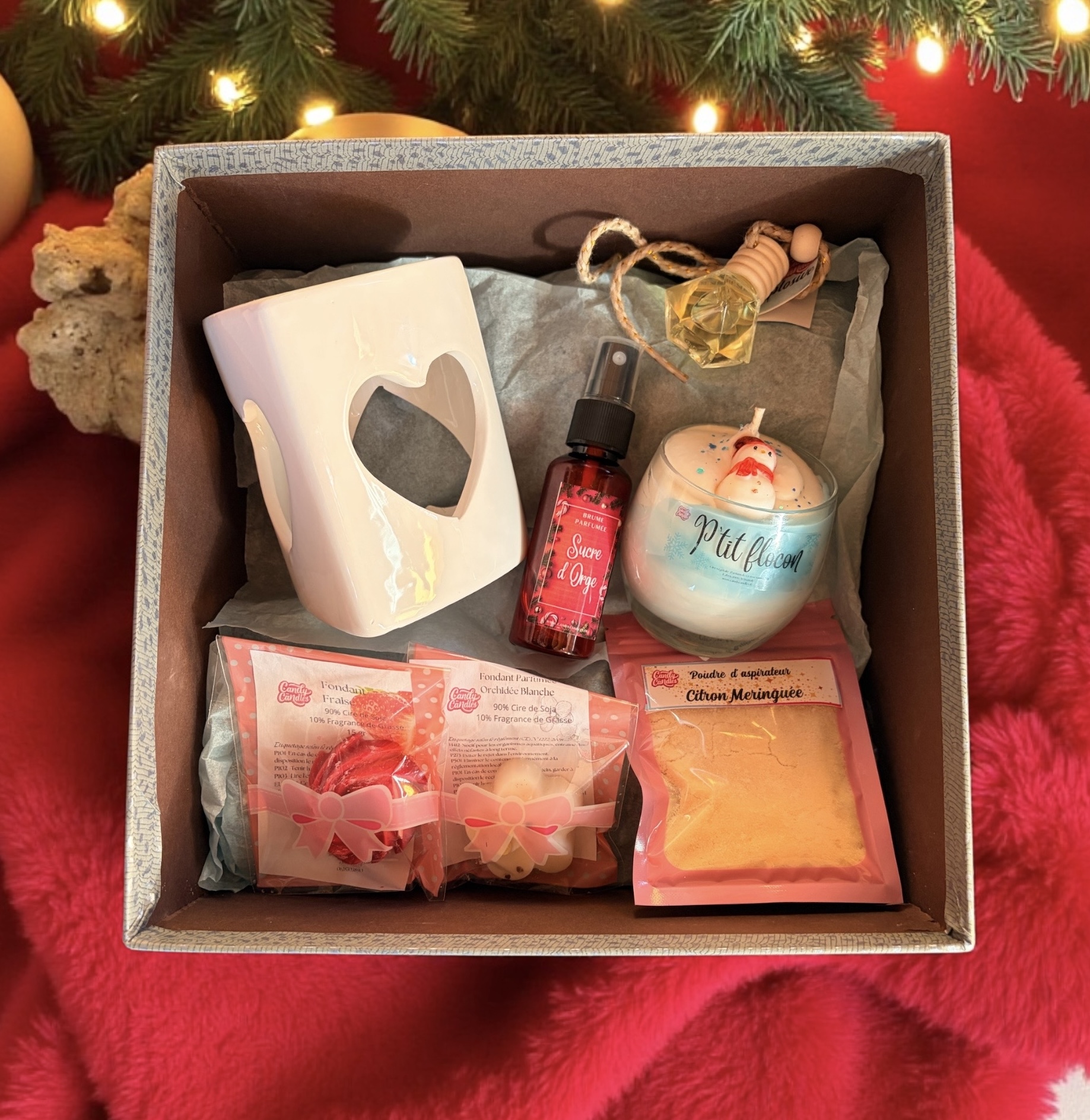 Découvrez notre magnifique coffret composé d'une bougie aux choix 100G, un spray d'intérieur, 1 fiole voiture, 1 poudre d'aspirateur brûleur coeur avec 2 fondants aléatoire., spécialement conçu pour offrir ou pour se faire plaisir.